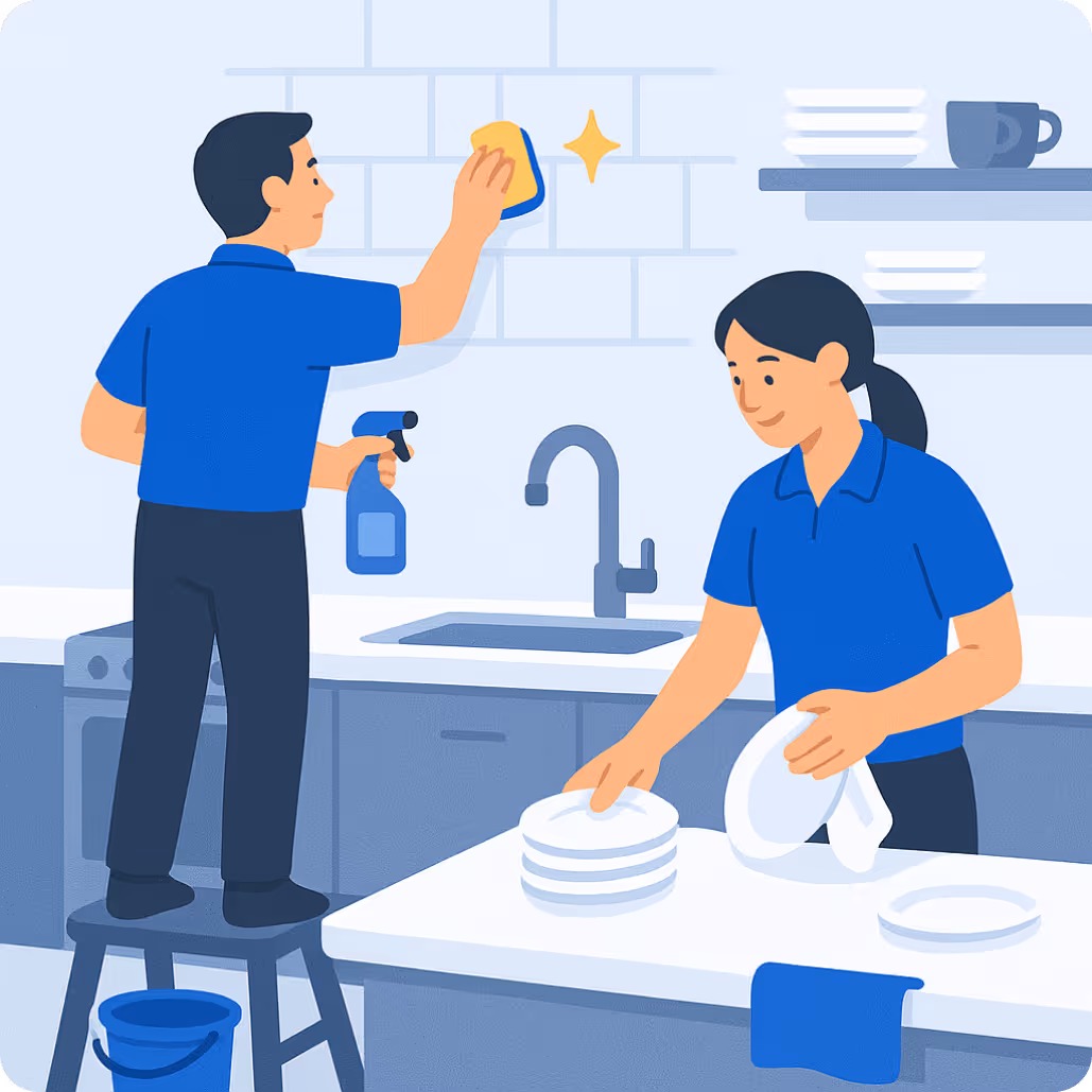 Our deep cleaning covers hidden and hard-to-reach areas. This includes scrubbing bathrooms, degreasing kitchen appliances (oven, stove, hood), dusting skirting boards, cleaning interior window ledges, dusting high corners, and sanitizing frequently-touched surfaces.