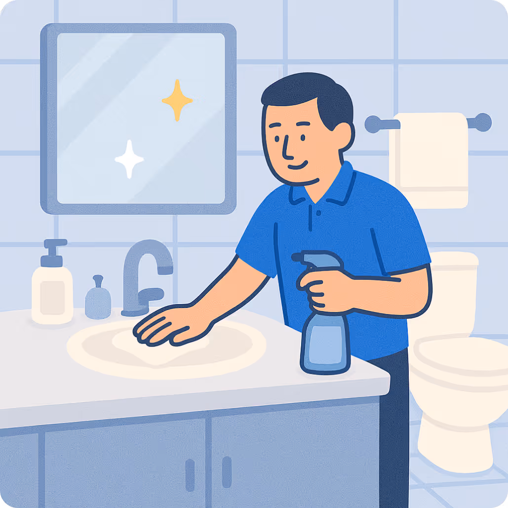Clean all surfaces, including toilets, bathtub/shower, glass, mirrors, basin, tap, ventilation fan, floors, drains, wall tiles, and door